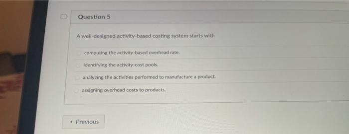 Identifying the activity-cost pools 2 Generally accepted in the phrase generally accepted accounting principles means that the. A well designed activity based costing system starts with Activity-based costing is a complex subject. Analyzing the activities performed to manufacture a product C. C Comy manufactures ustomized desks. Analyzing the activities performed to manufacture a product B. A well-designed activity-based costing system starts with. Analyzing the activities performed to manufacture a product.